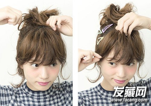 step2:将剩下的头发扎成一个高髻,也就是高丸子,用发夹固定。扎的时候注意不要让丸子太整齐,稍显凌乱也没关系,让头发微往外翘。
