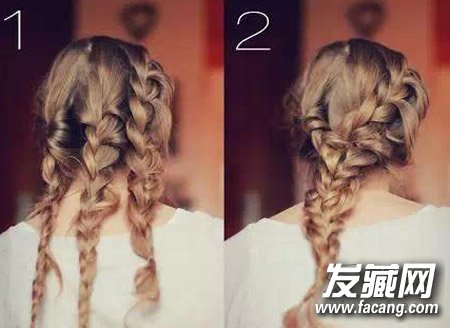 1、首先将头发分成三股,分别编成麻花辫,记得将编好的辫子拉扯蓬松。