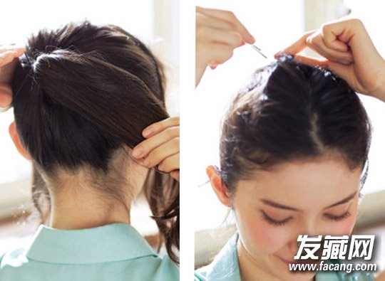 step2:将刘海中分,并分开向后扭卷,最后在后脑处用发夹固定在一起。制造头顶的蓬松高度。