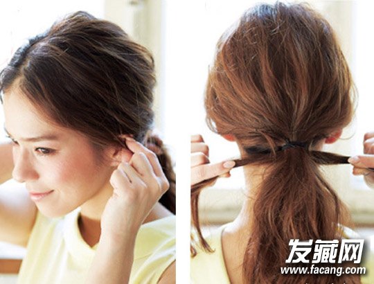 step1:在后颈上面一点的地方将头发扎成一个低马尾,用手指轻捏耳上的头发。