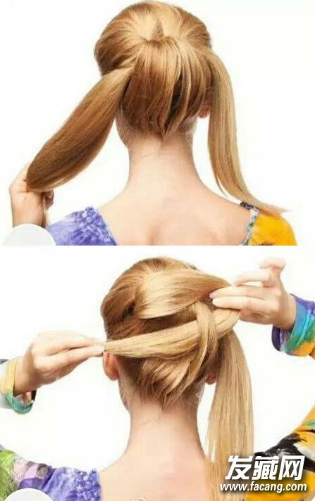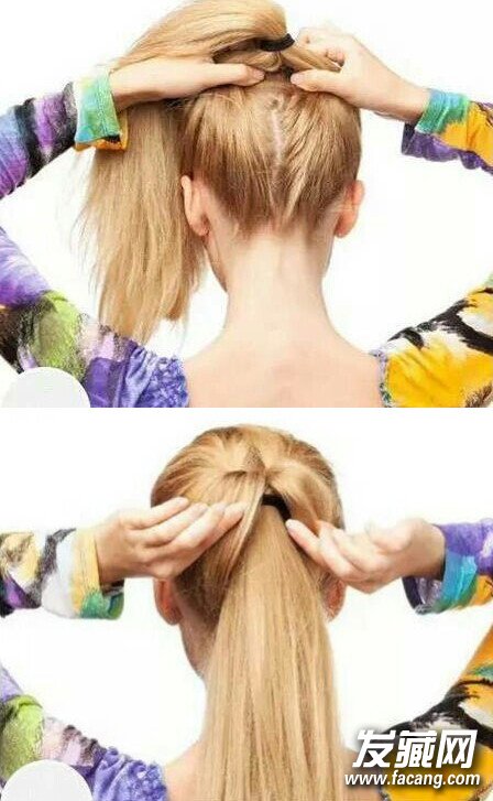 【盘发教程step01】首先,用发圈高高绑起个马尾造型,将发圈上面的秀发挖出一个洞,然后把马尾的秀发从发洞中穿过去。