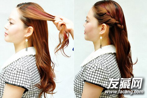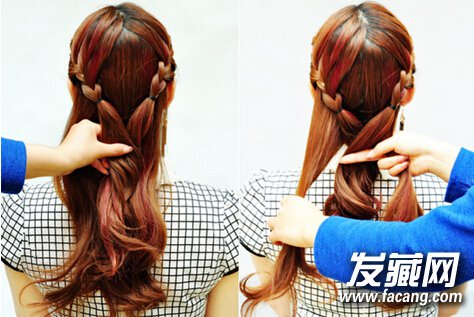 【花苞头盘发step02】接着,右侧也是采取同样的方式来进行编发即可。然后再与剩下的秀发合在一起,再进行三股辫的编发。