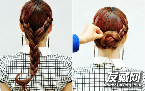 【花苞头盘发step03】编好的三股辫利用皮筋固定即可,然后将秀发稍微扯松些,让发型更显蓬松自然。