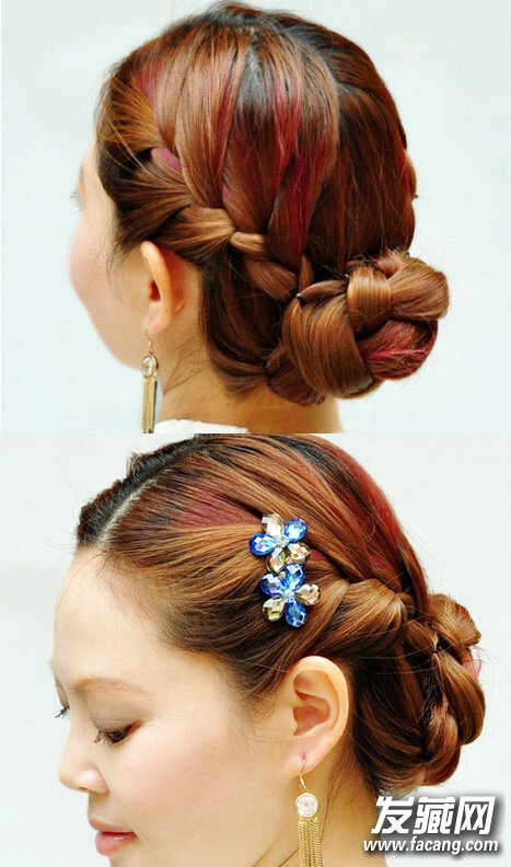 【花苞头盘发step04】然后,将三股辫从下往上卷起,弯曲盘旋在发际线处,将发梢藏在盘发中,再利用一字夹固定好两侧,为了发型的饱满,可以再轻扯脑后的秀发。