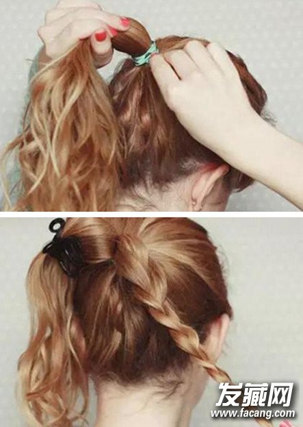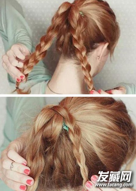 首先将头发打理的蓬松一点,然后扎一个高马尾。然后将马尾分成两等分,均编成麻花辫。