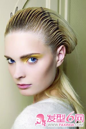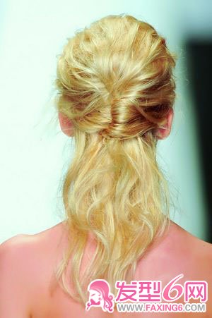 整体的波浪弯曲感,慵懒中透出清新的感觉。蓬蓬的发顶给人轻松写意的印象,半盘发的马尾动感十足。
