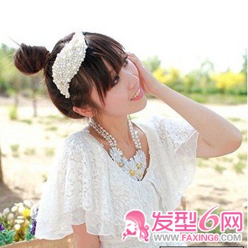 发亮丽的清新少女盘发,削薄的齐刘海,制造精灵女生形象,亮眼的珍珠发箍搭配白色蕾丝裙,浪漫灵动的小女生。