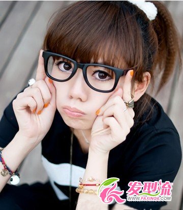 青春活力马尾发型,清爽简洁,轻薄刘海,精灵可人,黑色眼镜框的搭配个性搞怪。适合古灵精怪学生!