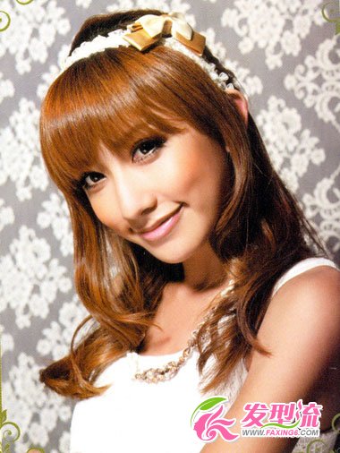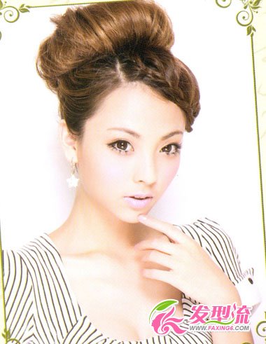 由马尾精心打造出的20世纪复古的公主发髻突显了淡淡的小女人味,麻花辫式刘海是这款发型的亮点,令可爱度直线上升。