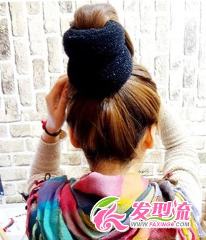 第二步 准备一大一小两个海绵卷,套进刚刚扎好的马尾里面去。