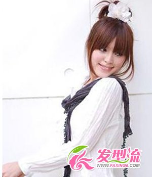 这款盘发发型图片是具有可爱风格的,是80后、90后菇凉们的好选择。略长的平刘海半遮眼睛,透出几分诱人的神秘魅惑和萌萌的味道。两侧余留几缕发丝,丰富了造型感,也有利于修饰脸型。顺直的长发高高盘起,尽显女生的甜美可爱气息。加上花朵发饰更显清新优雅。