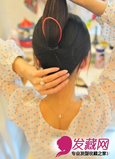 将编发起的一段插入头发内 然后将编好的马尾反方向从圈内塞过去 如图