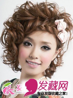 将卷发侧扎,小波浪卷弧度和别致的刘海编发加在一起,优雅有特点。