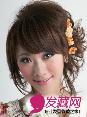 稍稍有点丸子形状的盘发,在蓬松的盘起的发尾扣上小花朵作为装饰,时尚与清新并重。