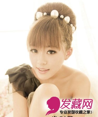 圆形的花苞头扎发,周围利用超大珍珠链饰点缀,青春甜美的公主味十足,薄碎的齐刘海瞬间突出了一个娇小的瓜子脸型。