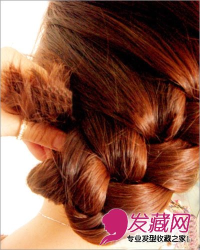 第五步:最后将剩下的发尾向里弯曲,用黑色发夹固定,并收尾。