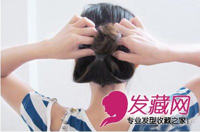 然后把扎好的马尾拉起,慢慢塞进刚才耳际两旁扎好的马尾内。
