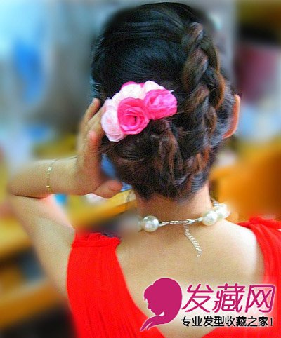 用小夹子很随意固定住,然后再加点点缀,很有温婉气息的麻花辫盘发呢。