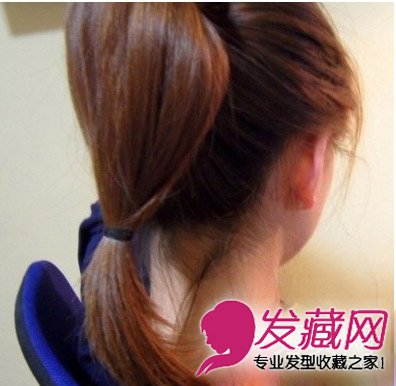 第二步:为了米面马尾的碎发在盘发时散开,在接近发梢的位置扎上一个皮筋固定一下。