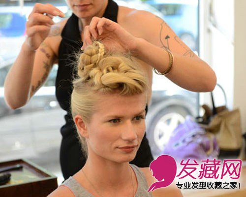 将第一层编好的头发盘成一个发髻,再将后面的麻花辫子与上面发髻合成一体,做出好看又立体的造型,用发夹固定发根就可以了。