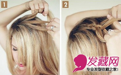 头发侧分,然后在最上面的挑出三撮头发,按照麻花辫的方式沿着头部编出麻花辫。这一步要慢慢来哦,如果太急会让头发不够平顺,编出来的麻花就好不看咯。