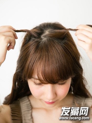 step2:沿着刘海从头顶取出两束头发分别扭转成发辫。