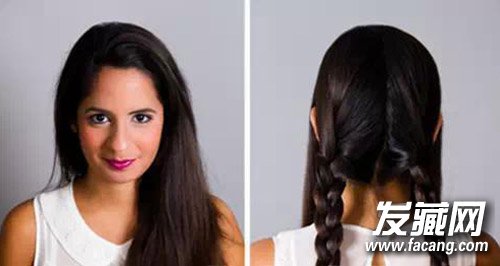 第一步:将全部头发分成前后左右四份,前方左右两侧的发束适量即可,少于脑后方的两束头发,然后将脑后方的两束头发分别编成三股辫。