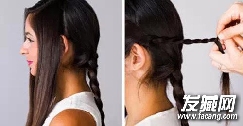 第二步:将前方左右两侧的发束同样编成稍细的三股辫。