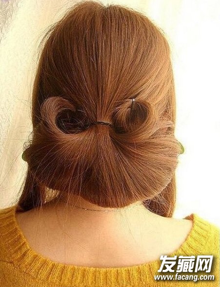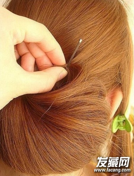 step6、将扎好的马尾从里面往上拿起,用小发夹把马尾末端固定在里面,然后从马尾的两侧分别拿起,用发夹固定,固定的位置会形成2个小洞,弄好后整个发髻会呈现扇形。