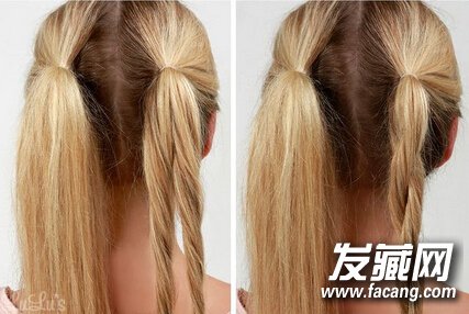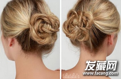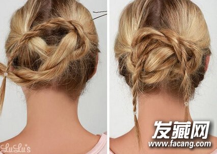 简单盘发教程03》》》》》旋转缠绕后的两条辫子,会比普通的麻花辫更显特别喔!将两条辫子相互交叉穿过,形成一个宽松的结(如图所示)