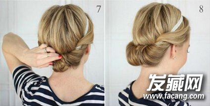 盘发教程step4》》》》》麻花辫固定好之后,再将另一边的秀发围绕着发带不停向里面进行卷曲固定(如图)只需重复步骤到发型的中间位置即可停止。