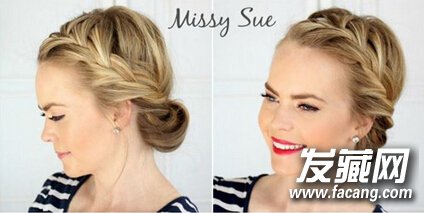 盘发教程step3》》》》》麻花辫的编织一直编到耳朵下方的位置即可,然后只需将麻花辫的发尾卷曲塞入发带内固定即可(如图)