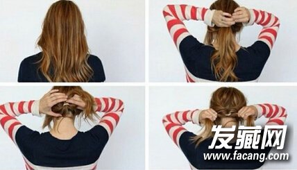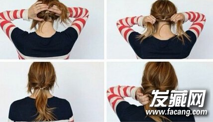 新娘盘发教程02》》》》》绑好马尾之后,将马尾上方轻扯开来,将剩余马尾的头发向上穿进刚扯出的洞里(如图)