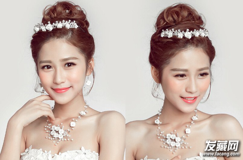韩式新娘盘发04》》》》》普通的盘发造型大多相同,但这款双盘发的造型可是新颖独特喔。麻花辫的编制完成后将其分别盘成两个小花苞头,立显娇俏可爱的风格,加上细碎的韩式空气刘海的配合,整个发型美得不可言喻。