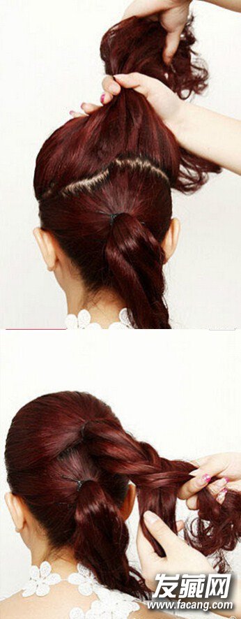 【新娘盘发step02】然后再将上方的秀发用一次性橡皮圈固定之后,再进行麻花辫的编织,麻花辫编织的手法可以利用宽松的扎发处理喔!