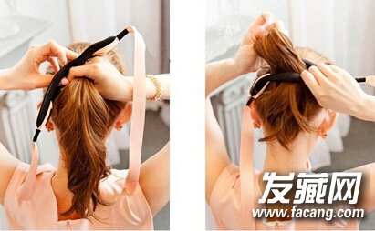 【盘发器使用step02】再将事先准备好的海绵飘带盘发器轻轻套入马尾之中。