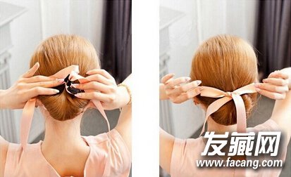 【盘发器使用step05】再托着整个盘发造型,轻轻拨松之后再将两侧的发带绑成一个蝴蝶结的造型,注意在绑法的过程中一定要紧实一些。