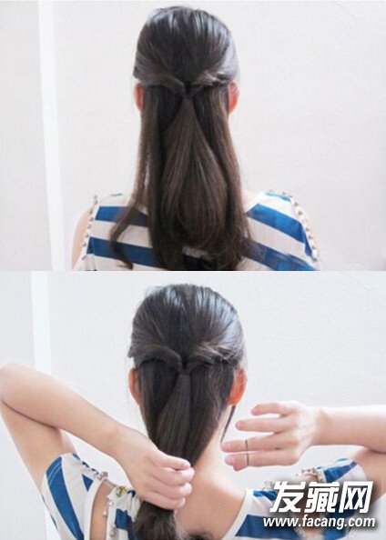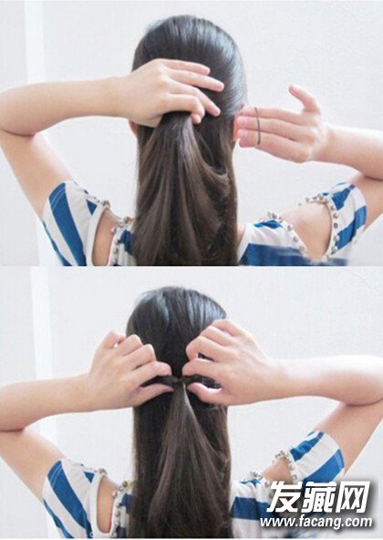 【韩式盘发step2】然后,将半扎发拉出一条缝,把马尾从外面往里面塞进去,再拉紧固定(效果如图)