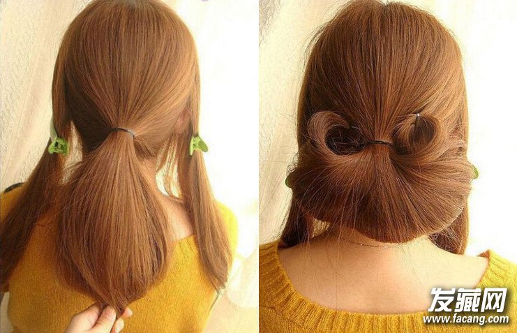 【盘发教程step03】接着,将中间的扎发向上卷曲盘成一个低盘发的造型,然后利用一字夹将其固定(如图)