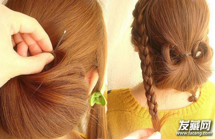 【盘发教程step05】最后,将两条麻花辫相互交叉盘绕在盘发造型上即可,同样是利用一字夹加以固定。