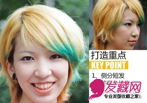 除了浅金色跟荧光蓝区分明显,这款发型发丝长度也有明显的分阶,并没有刻意营造空气感,小心机却让原本最容易显土气的短发显得非常干练而不失层次感,大侧分营造出的小脸效果也很明显哦。