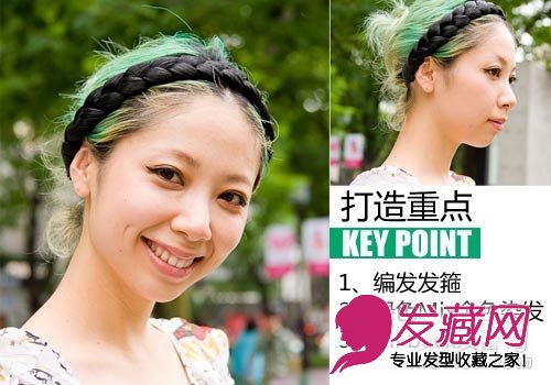 这款发型倘若没有亮色染发,相比只是沉闷姑姑头一个,又一如模特准备上台前的All back,未作任何造型因而显得毫无亮点。但是容易让人显得幼稚的绿色染发此刻配上黑色编发发箍,却神奇的显得知性气质十足,在浅金深棕染发横行的街头,一下子抓住街拍镜头的注意力。