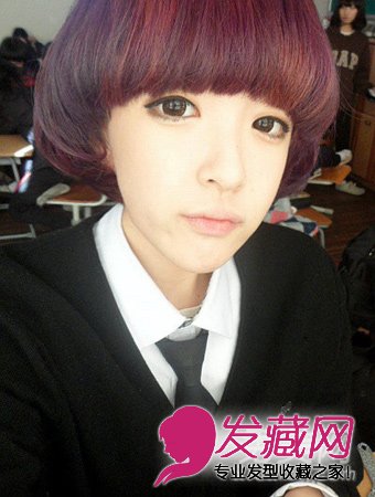 一款紫色系的渐变色蘑菇头发型,齐刘海很好的凸显了明亮的大眼睛,整体环绕式的包围发型,显得头型更加的饱满蓬松。是一款非常炫的潮流发型。不过此款发型比较适合脸型偏小的女生,大脸女生可不要轻易尝试哦