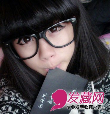 厚重的齐刘海突出精灵的大眼睛,黑色齐肩直发,非常的纯净可人,与超大黑色眼镜框搭配将可爱萌味进行到底。