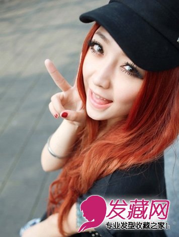 橘红色的靓丽非主流发型,长卷发的蓬松卷线条,质感十足的头发发丝,娃娃眼妆的双瞳,超活力可爱的女生发型