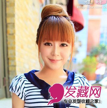 带着甜美气息的非主流花苞头,齐齐的刘海,显得清新可爱,两颊的发丝更添动人气息,时尚感的亚麻黄色为整个发型加分不少哦。