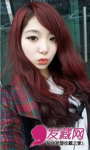 一款酒红的染发,非常的好看。凸显出了肌肤的白皙,斜刘海也很好的修饰了脸型。长卷发甜美又不失性感。