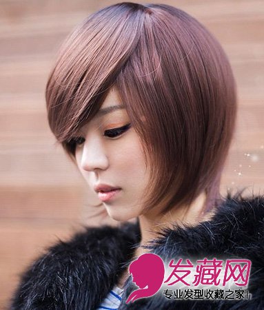 一款紫红色的斜刘海短发发型,大片的修刘海搭在脸上,是一款典型的韩式短发发型。这种类型的短发往往会给人一种妩媚的感觉。