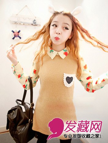 萌萌的表情十分惹人爱,随意披肩的长发蛋卷头,搭配金棕色染发颜色非常的青春洋溢。