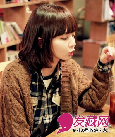 发藏小编点评:巧克力色染发+齐刘海短卷发 巧克力色的染发颜色一直是少女们的最爱。此款发色不但显的人白皙,而且给头发一种光泽感。